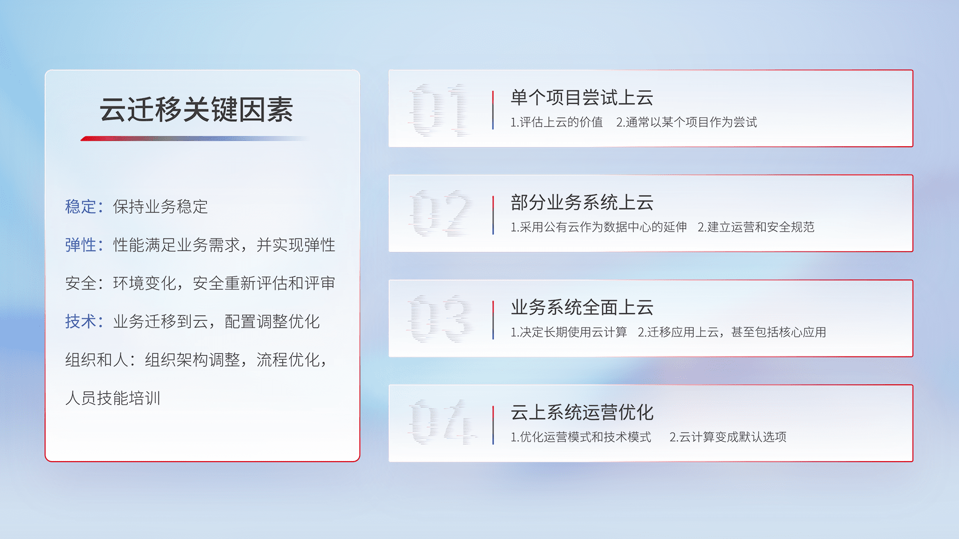 结合实际业务,,,,从规划设计、、、、云平台选型、、云原生改造、、、、数据迁移、、集成交付,,迁移全过程为客户识别最佳上云路径,,,,做好风险识别管理,,设计网络架构、、、、身份权限、、、、安全审计合规、、、操作审计、、、日志审计、、监控告警策略、、、、多站点容灾设计等,,,对云上基础设施进行整体规划,,,提升IT治理水平,,以满足弹性、、高可用、、、、高性能的需求。。。