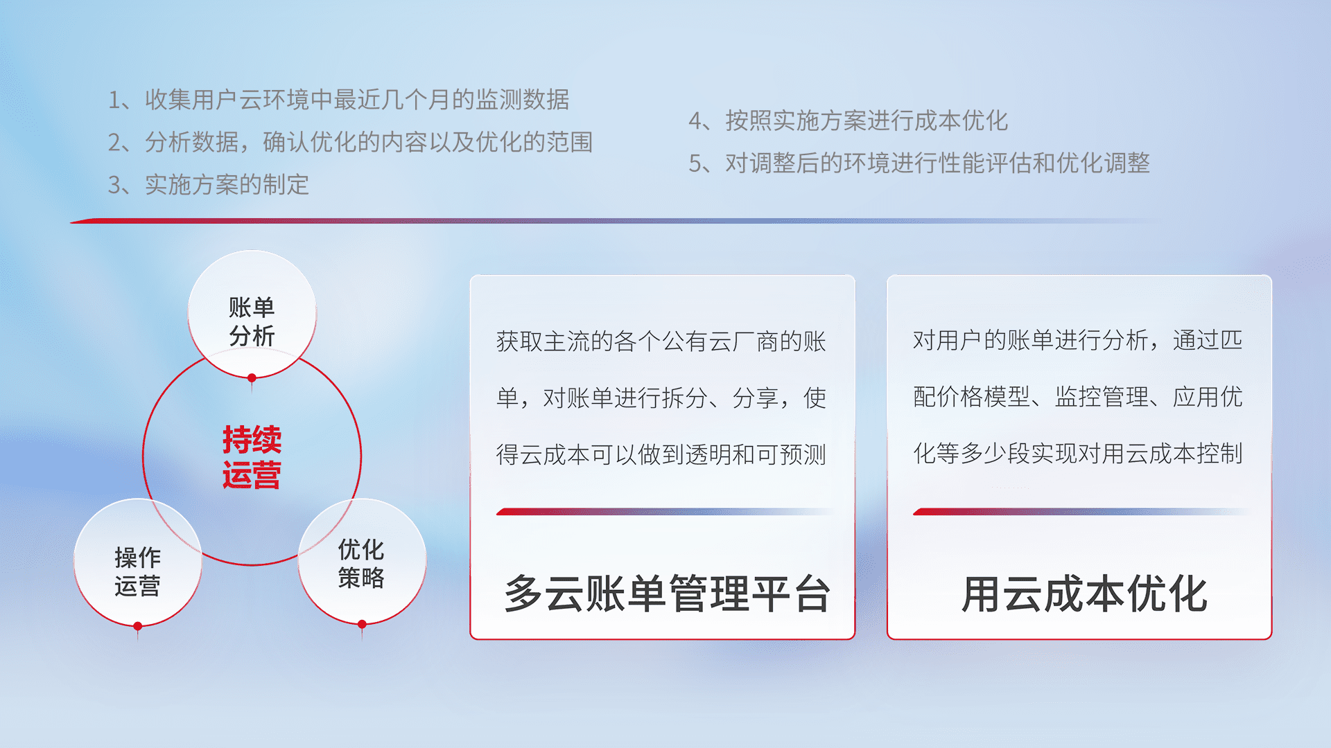 通过多云纳管,,,以统一的资源数据模型把客户的云资源进行抽象和封装,,,,进而实现对多云资源的统一操作,,,保障云资源管理的可靠性、、、稳定性与可用性。。量身定制化运维内容,,配置、、、、开发运维、、、补丁管理、、、、备份、、、、监控、、认证和访问管理、、、、审计和日常巡检等,,,,保障在用云过程中的可靠度,,,稳定度以及高可用率。。
